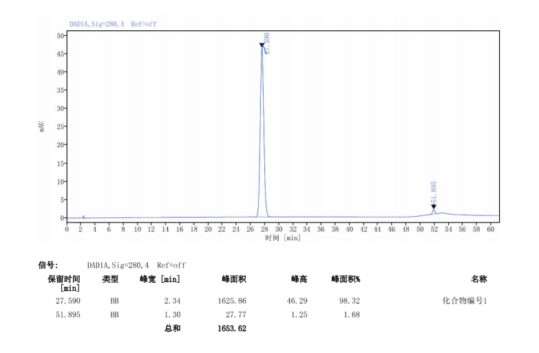 Agilent ZORBAX Eclipse plus-C18 4.6*250mm,5um;Column temperature:35℃; Detection Mode:UV280nm ; Sample dissolution:Methanol; Flow Rate: 1.0ml/min; Mobile Phase: A, Methanol, B,0.1%Phosphoric acid in water (PH=6); Gradient elution:A,55%,45min,55-60%,5min